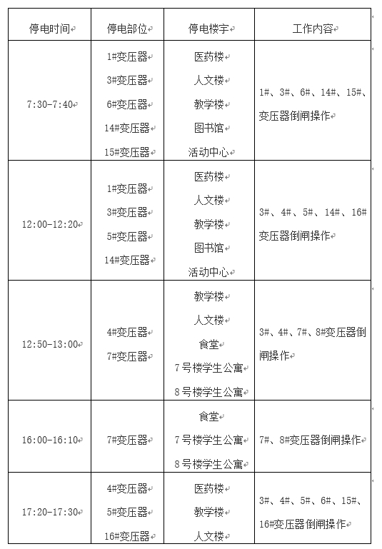 特别提示:请各相关学院(单位)提前做好停电前的准备工作(电梯将停用),仪器、电脑等用电设备提前关机,避免停送电期间因电压大幅变化造成设备损坏。如遇不可抗因素,可能临时延长停电时间,实际恢复供电时间不另行通知,停电期间严禁触模用电设备,以防发生意外,如遇极端天气时间另行通知。停电当天因施工造成变压器负荷较大,请暂停空调等设备使用。给各位老师、同学带来不便,敬请谅解!