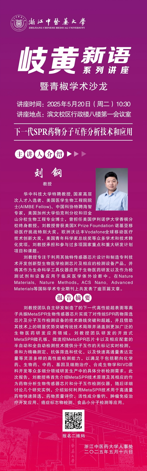 本期嘉宾邀请华中科技大学刘钢教授现场讲座,主题为:下一代SPR药物分子互作分析技术和应用。