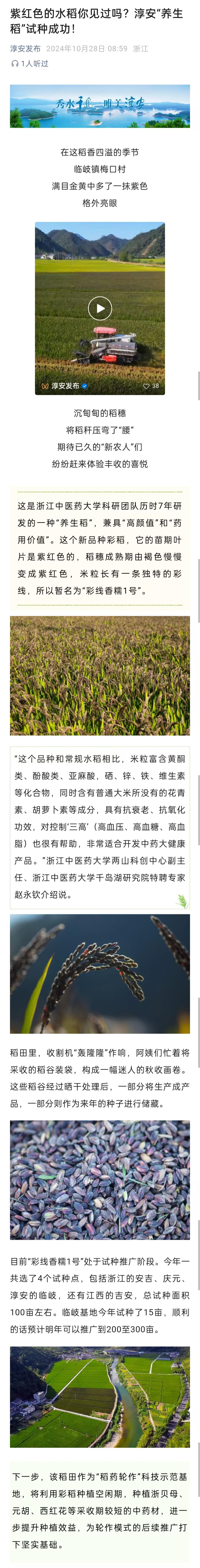 淳安发布:紫红色的水稻你见过吗?淳安“养生稻”试种成功!