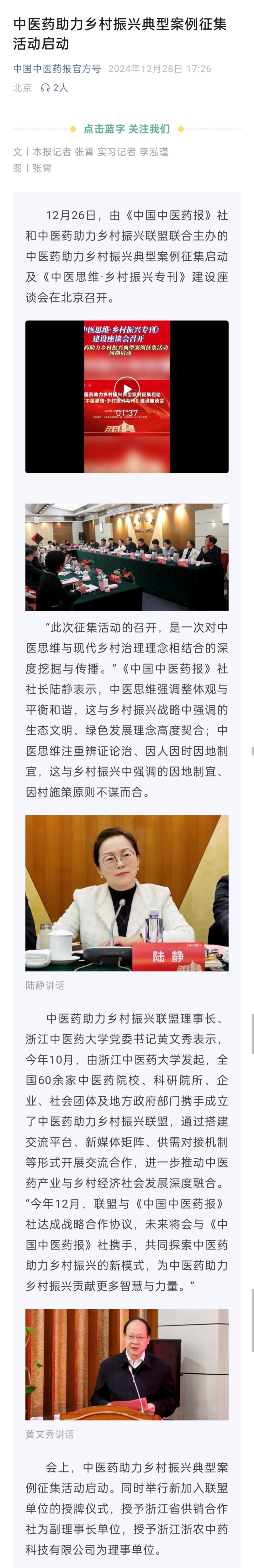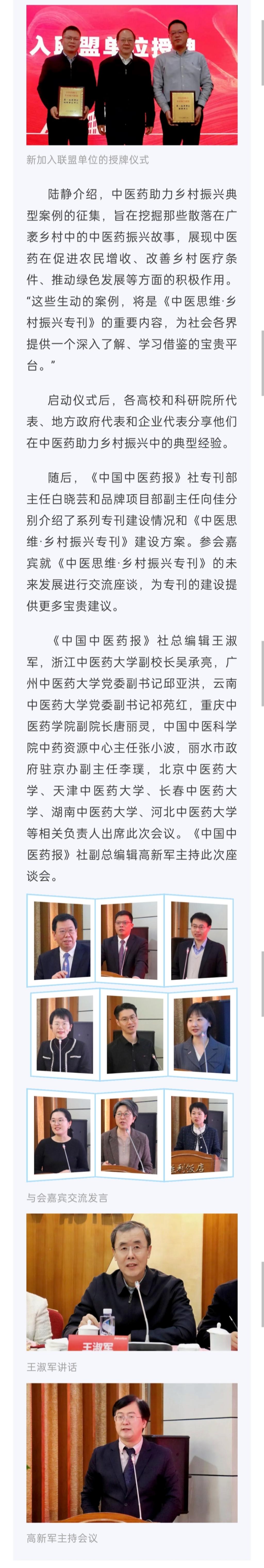 会上,中医药助力乡村振兴典型案例征集活动启动。同时举行新加入联盟单位的授牌仪式,授予浙江省供销合作社为副理事长单位,授予浙江浙农中药科技有限公司为理事单位。