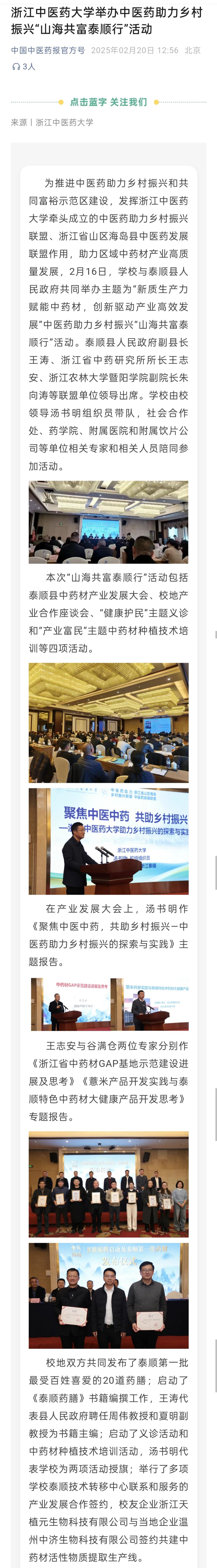 为推进中医药助力乡村振兴和共同富裕示范区建设,发挥浙江中医药大学牵头成立的中医药助力乡村振兴联盟、浙江省山区海岛县中医药发展联盟作用,助力区域中药材产业高质量发展,2月16日,学校与泰顺县人民政府共同举办主题为“新质生产力赋能中药材,创新驱动产业高效发展”中医药助力乡村振兴“山海共富泰顺行”活动。泰顺县人民政府副县长王涛、浙江省中药研究所所长王志安、浙江农林大学暨阳学院副院长朱向涛等联盟单位领导出席。学校由校领导汤书明组织员带队,社会合作处、药学院、附属医院和附属饮片公司等单位相关专家和相关人员陪同参加活动。