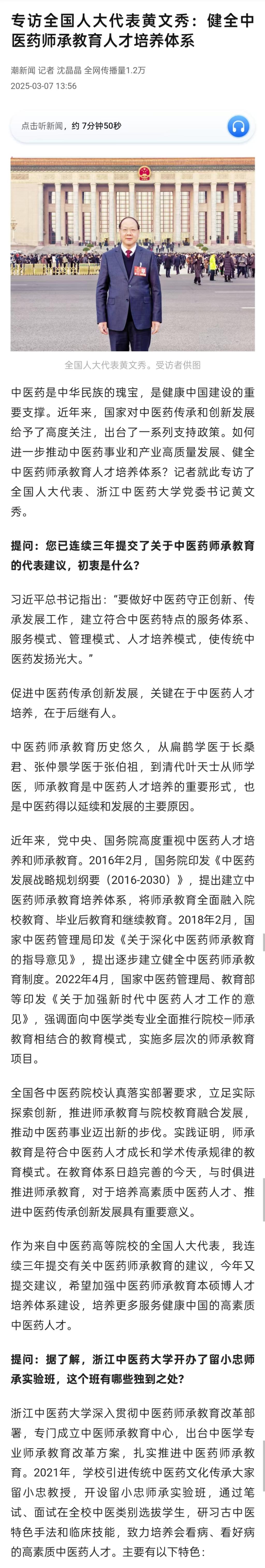 作为来自中医药高等院校的全国人大代表,我连续三年提交有关中医药师承教育的建议,今年又提交建议,希望加强中医药师承教育本硕博人才培养体系建设,培养更多服务健康中国的高素质中医药人才。