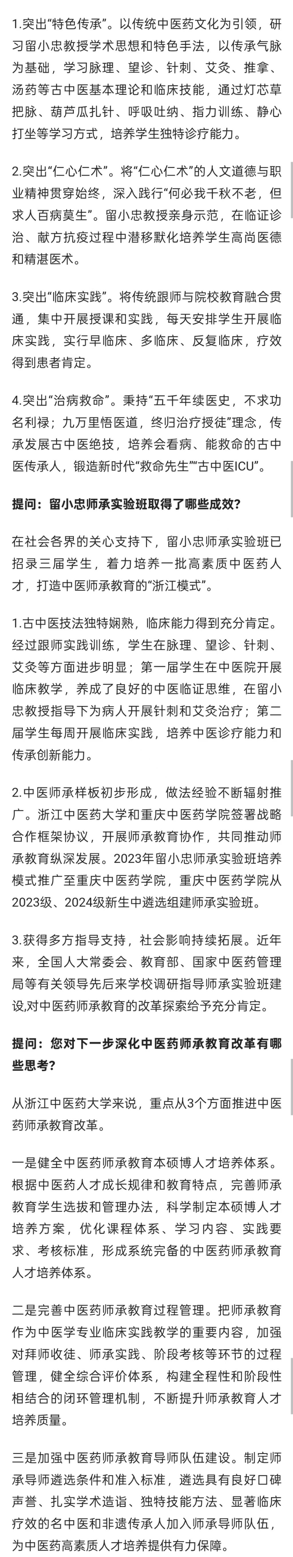 提问:据了解,浙江中医药大学开办了留小忠师承实验班,这个班有哪些独到之处?