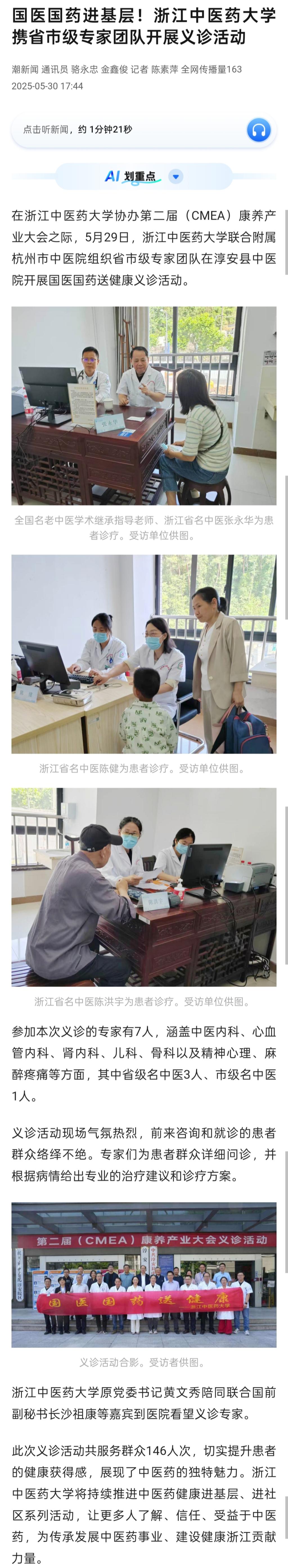 在浙江中医药大学协办第二届(CMEA)康养产业大会之际,5月29日,浙江中医药大学联合附属杭州市中医院组织省市级专家团队在淳安县中医院开展国医国药送健康义诊活动。