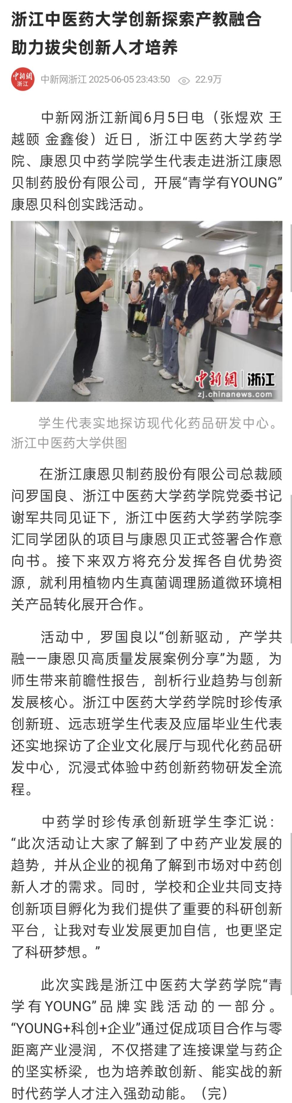 近日,浙江中医药大学药学院、康恩贝中药学院学生代表走进浙江康恩贝制药股份有限公司,开展“青学有YOUNG”康恩贝科创实践活动。