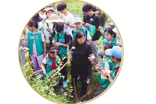 “天目千重秀,林木十里深”,“浙学少年团”的第一站是走进天目山国家级自然保护区,这里植被丰茂,是天然的“中草药宝库”。浙江中医药大学药学院的两位教授俞冰和张水利化身“向导”,带着孩子们走进山林采集中草药。