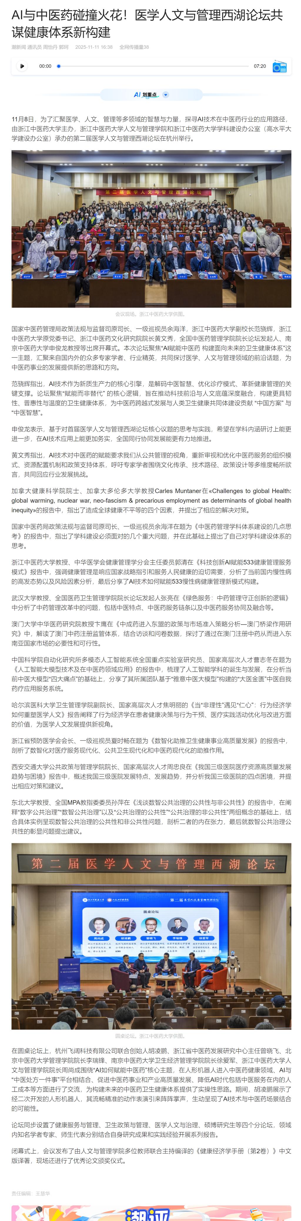 AI与中医药碰撞火花!医学人文与管理西湖论坛共谋健康体系新构建