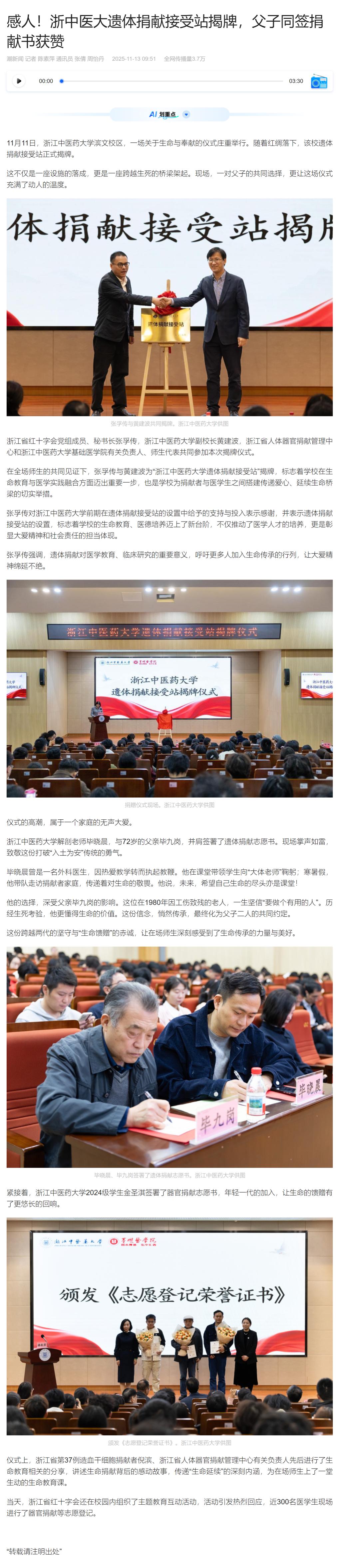 感人!浙中医大遗体捐献接受站揭牌,父子同签捐献书获赞